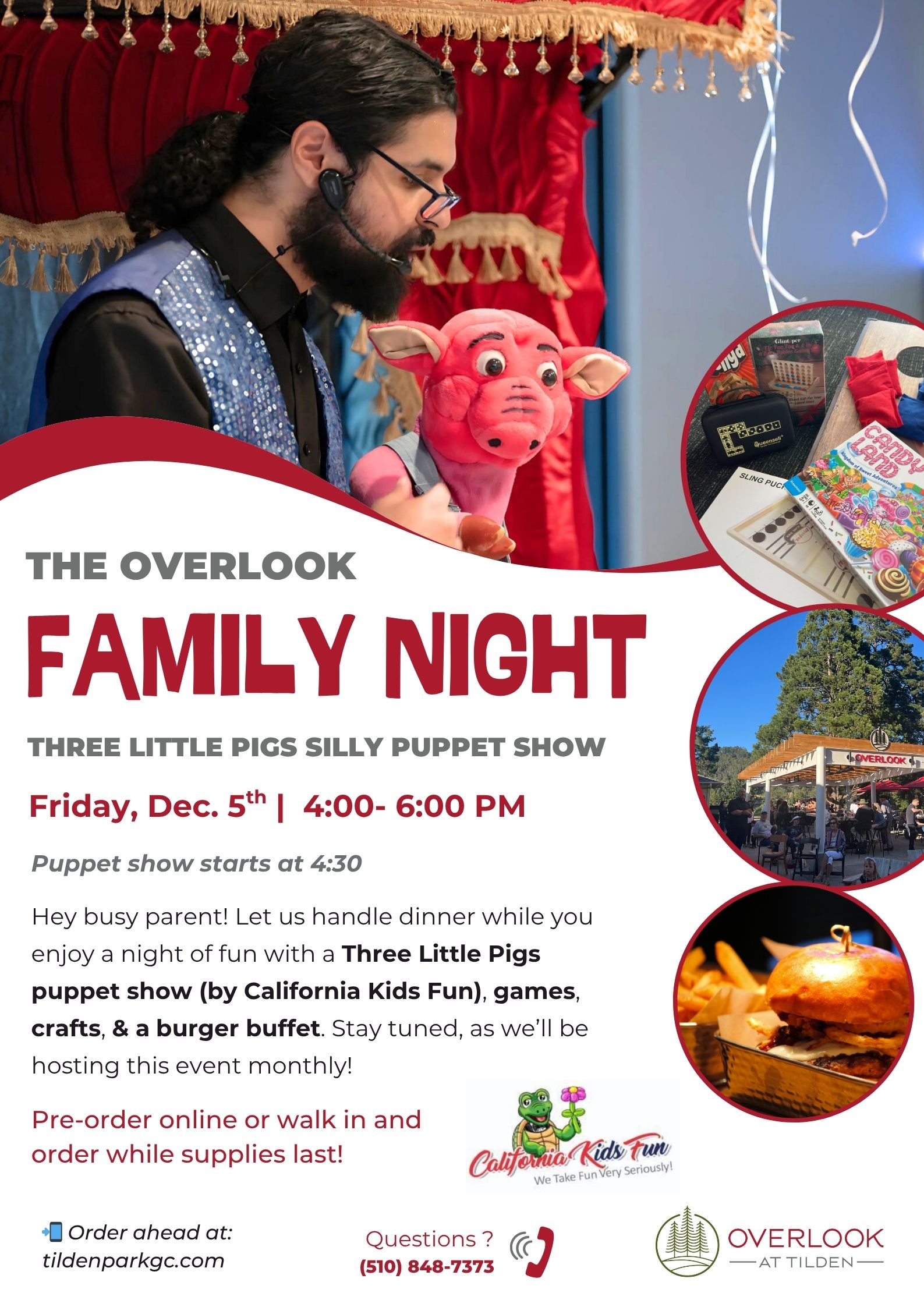 Family Night is back at The Overlook! Join us on Friday, December 5th from 4:00–6:00 PM for an evening of festive fun featuring a Three Little Pigs Puppet Show 🐷 by California Kids Fun starting at 4:30 PM. Enjoy games, crafts, and a build-your-own-burger buffet 🍔 (all included together in Family Night)! ✨ RSVP is […] ...